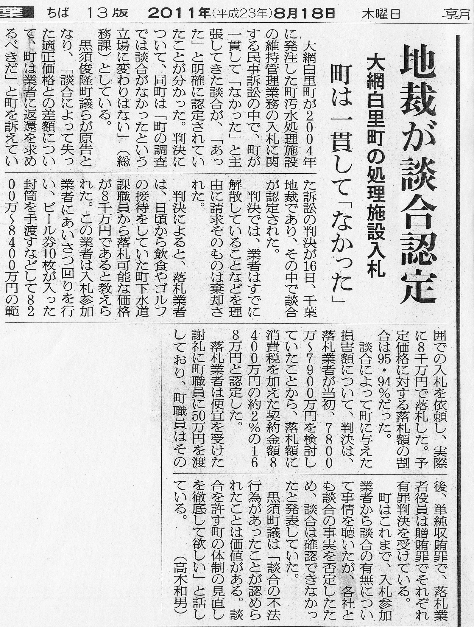 他の入札でも、大網小学校のプール建設工事が予定価格の96%もの高額で町内業者に落札されており、談合の疑いが強い入札です。