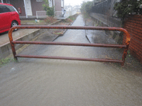 豪雨で役場近くの水路が氾濫