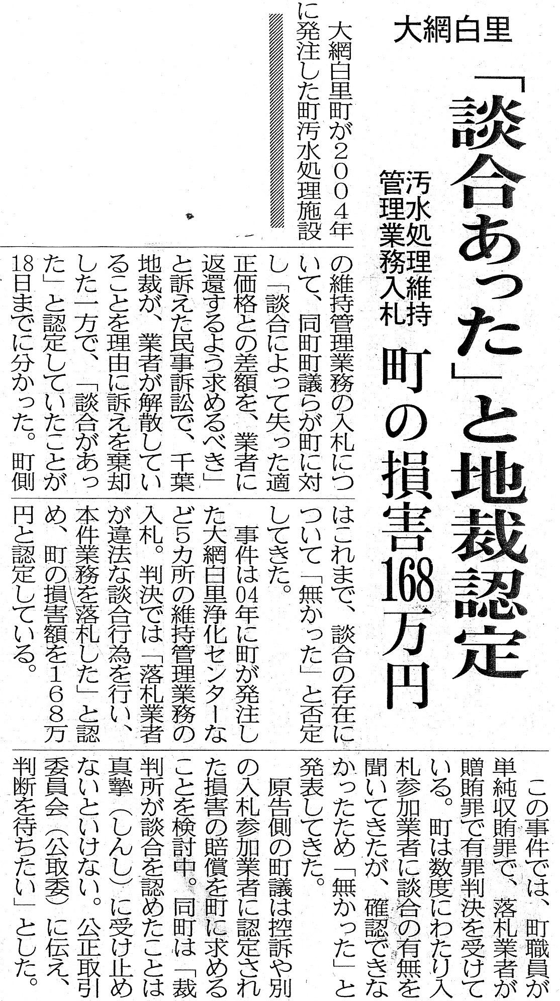 争点は2つ。地裁では談合と損害は認められたが、談合の首謀者が倒産等で支払い能力がないので町は談合の共犯企業も含めて損害賠償請求をしなければならないかどうかが争点の一つ。もう一つは、損害額の大きさである。